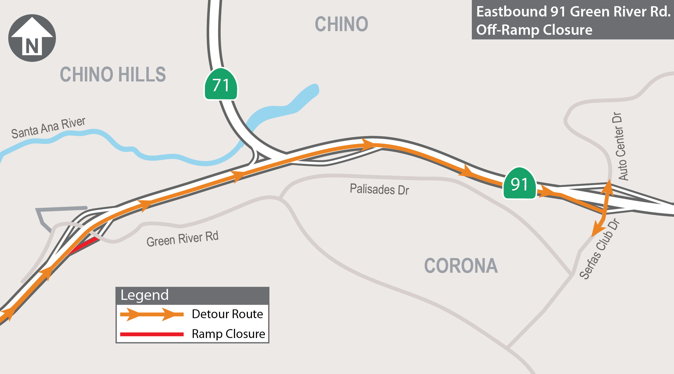Motorists will need to use the 71, 60, to 57 as alternate routes. For motorists who need to access Green River Road, they may do so by exiting Auto Center Dr./Serfas Club Dr. Fire, police, and emergency responders will have access. We are also informing residents and businesses of detours, traffic expectations, and to allow extra travel time.