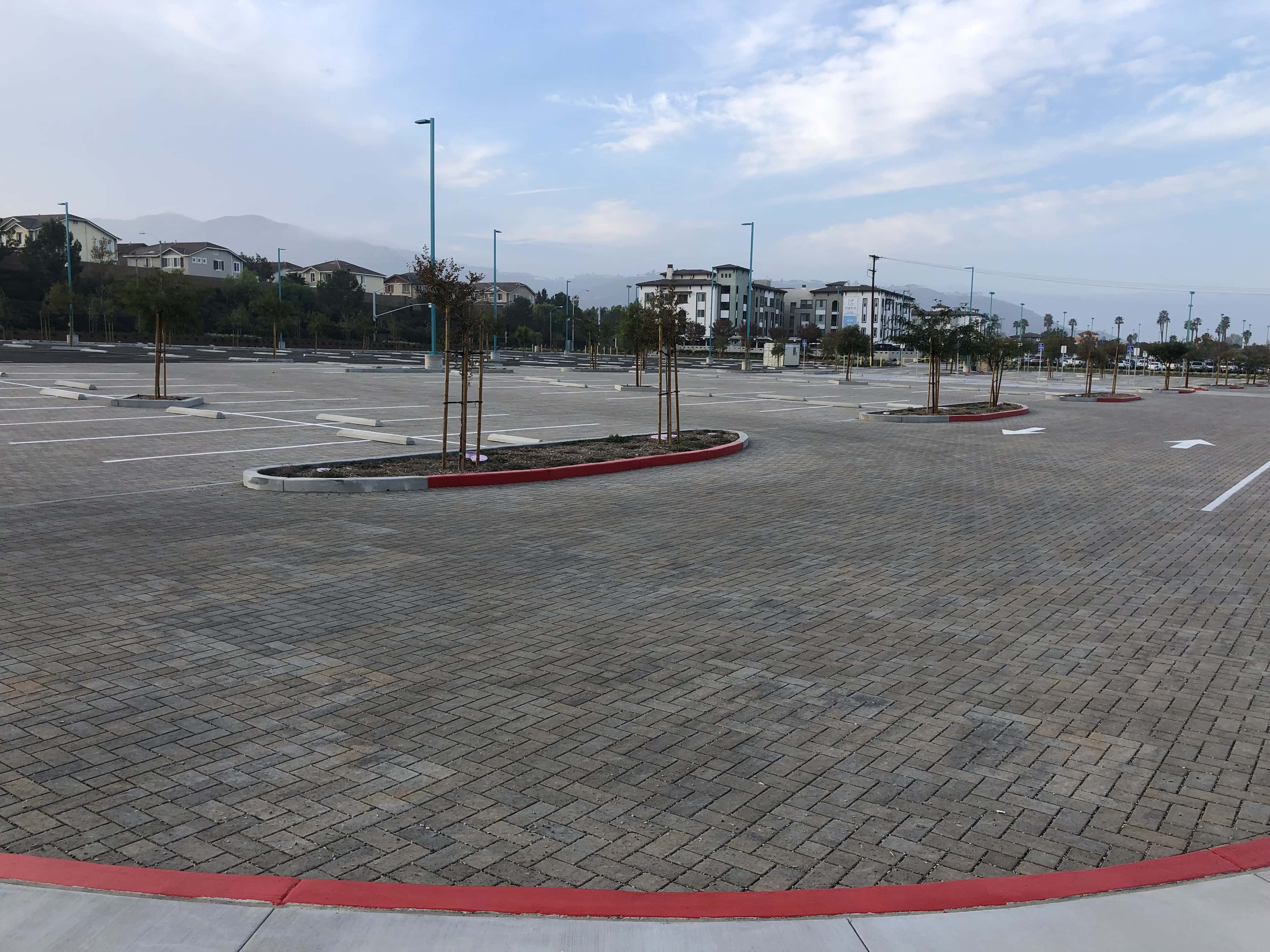 Crews placed new asphalt-concrete pavement and pavers, built curbs and sidewalks, and added a traffic signal and landscaped the area.