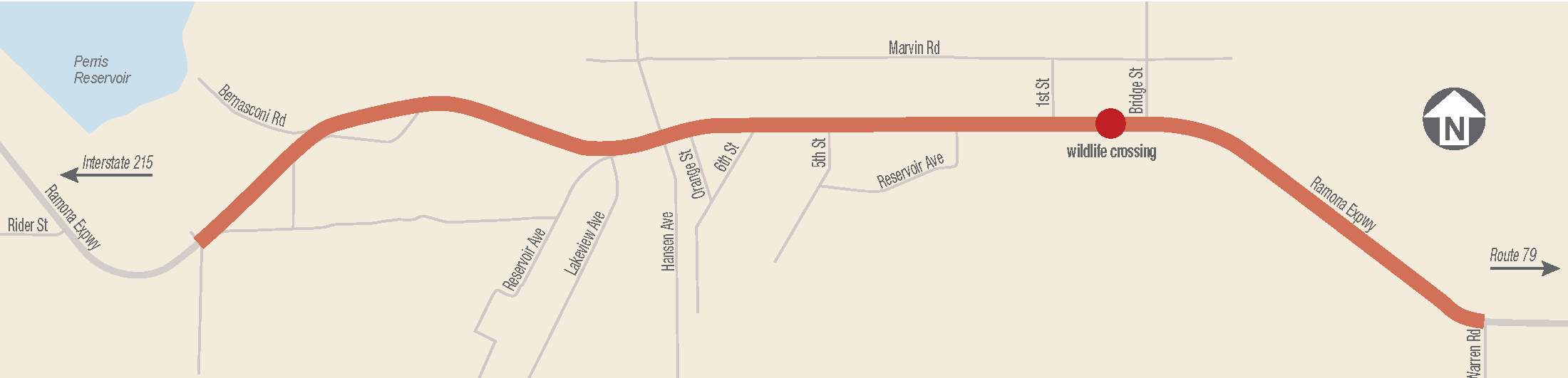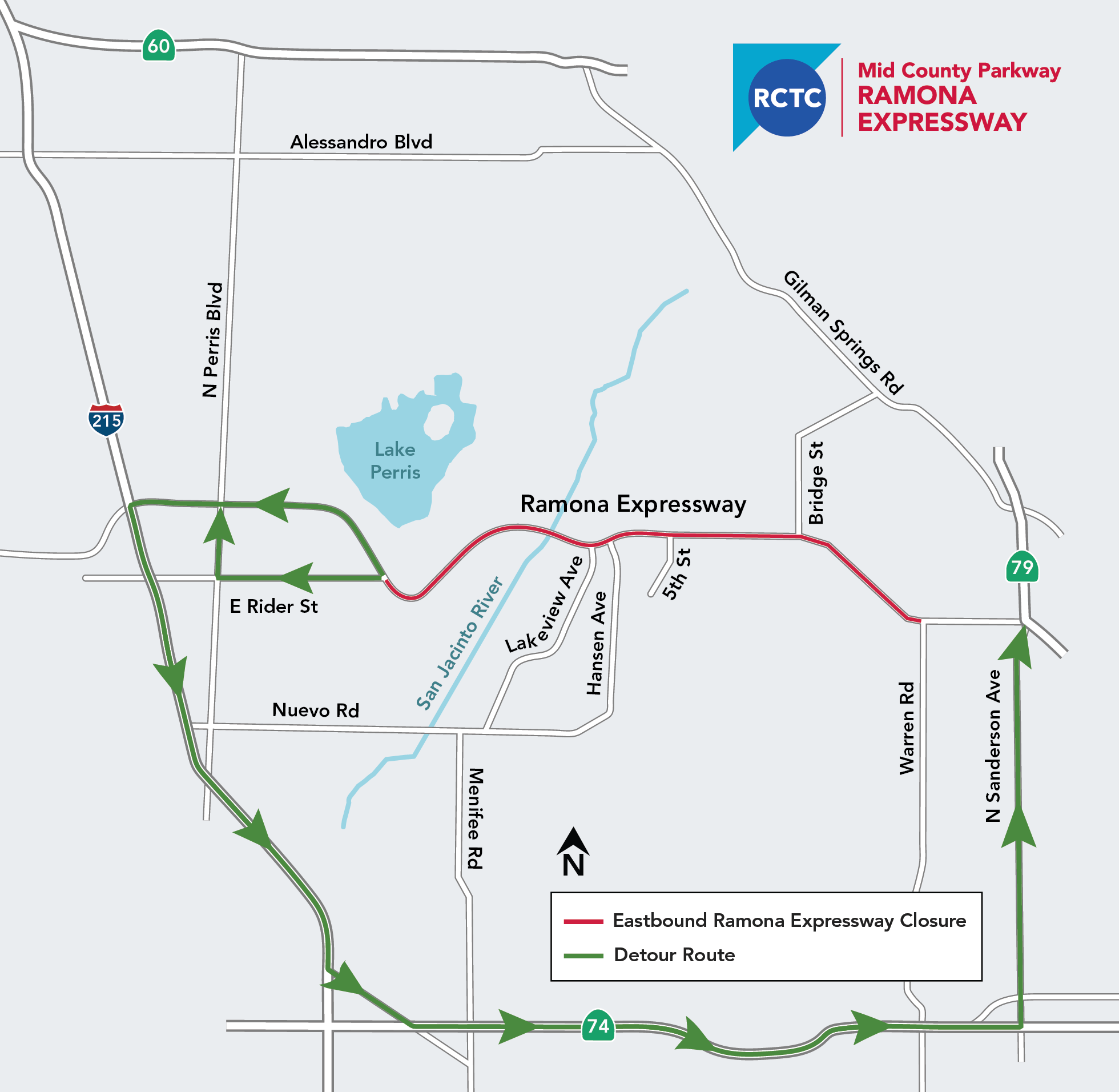 Full eastbound closure of Ramona Expressway from Rider Street to Warren Road | I-215, eastbound on State Route 74, northbound on N. Sanderson Avenue to Ramona Expressway |